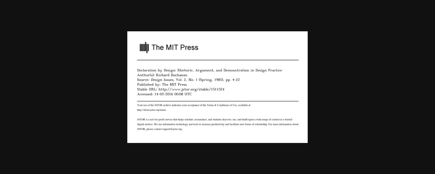 Una y otra vez, vuelvo al texto de Richard Buchanan Declaration by Design: Rhetoric, Argument, and Demonstration in Design Practice. En él, Buchanan nos recuerda que todo diseño es una forma de retórica. Comunica ideas, argumentos y visiones del mundo. Un objeto o interfaz diseñada no solo resuelve un problema funcional; expresa una visión de cómo podría ser el mundo y qué lugar ocupa el ser humano en él.